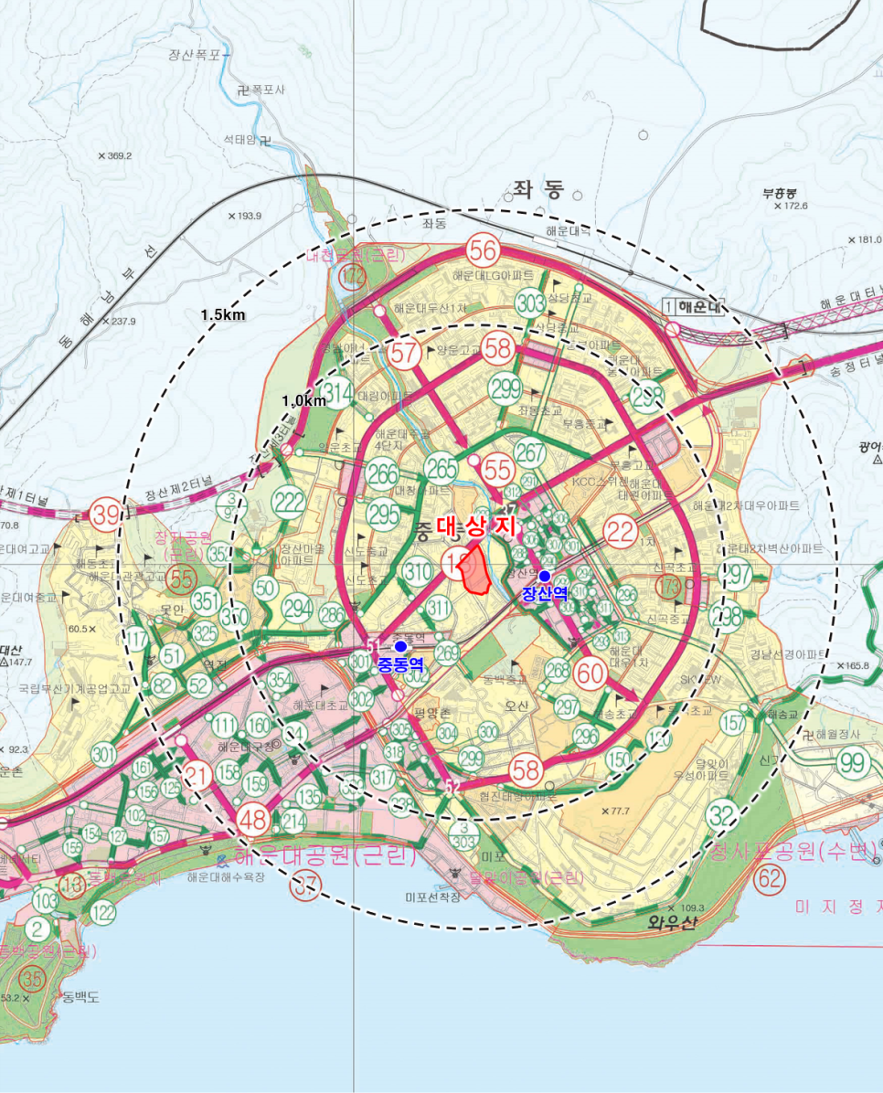 | 更改 | - | 位于海云台区中洞266号周边 | 第二种普通居住地区 | 第三种普通居住地区 | 4,286 | 285%以下 | ▪ 为了促进交通枢纽(长山站)区域内的综合土地利用,提高住宅供应,并引导计划性开发,故进行细分类用区域间的更改 |