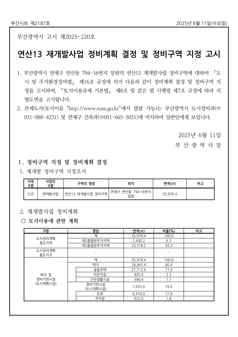 1. 釜山市连载区连山洞794-16号地区的连山13号再开发项目整治区域,依据《城市及居住环境整治法》第16条规定,决定整治计划并公告区域指定,同时依据《土地利用管制基本法》第8条及其实施令第7条规定公告地形图。